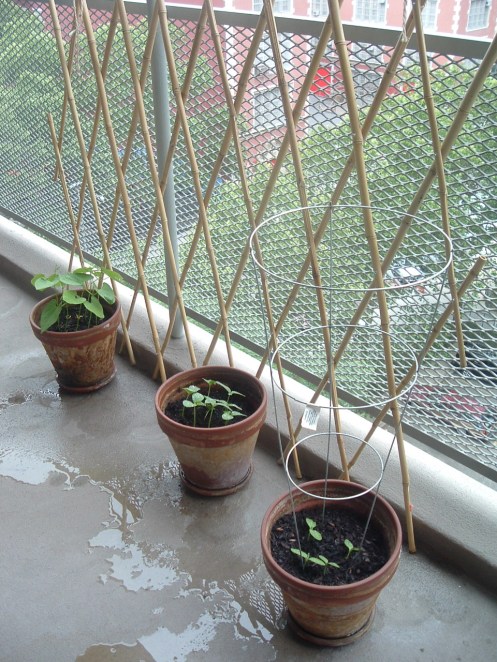 I can’t believe how fast the veggies are growing! I’m getting excited because I now have four squash seeds blooming and the pole beans are almost at the point where they’re going to have to be tied around the trellis. Here’s a wide-shot view of my patio garden:
